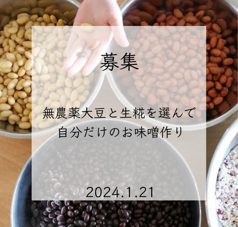 \ワークショップ参加募集/ 無農薬大豆と生糀を選んで自分だけのお味噌作り 大豆と生糀、それぞれを選んでいただき、【黒千石味噌】もしくは【紅大豆味噌】を作ります。 |