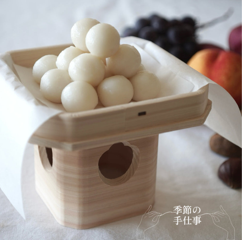 今回は三方 (さんぽう) にお団子をのせます。神様へのお供えを載せるための器です。綴じ目のない面を神様、ここではお月様の方にし、綴じ目のある面を手前にします。