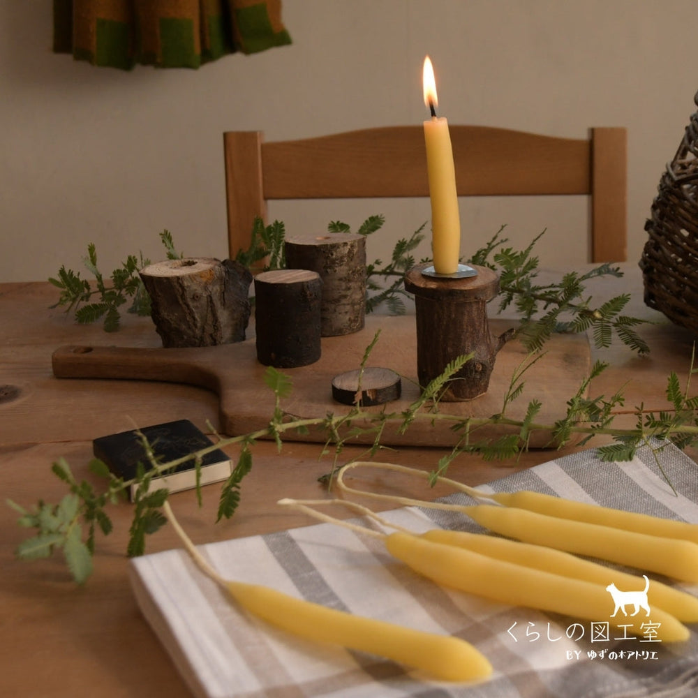 私はこの蜜蝋キャンドルに似合う、丸太のキャンドルスタンドを作って楽しんでいます。