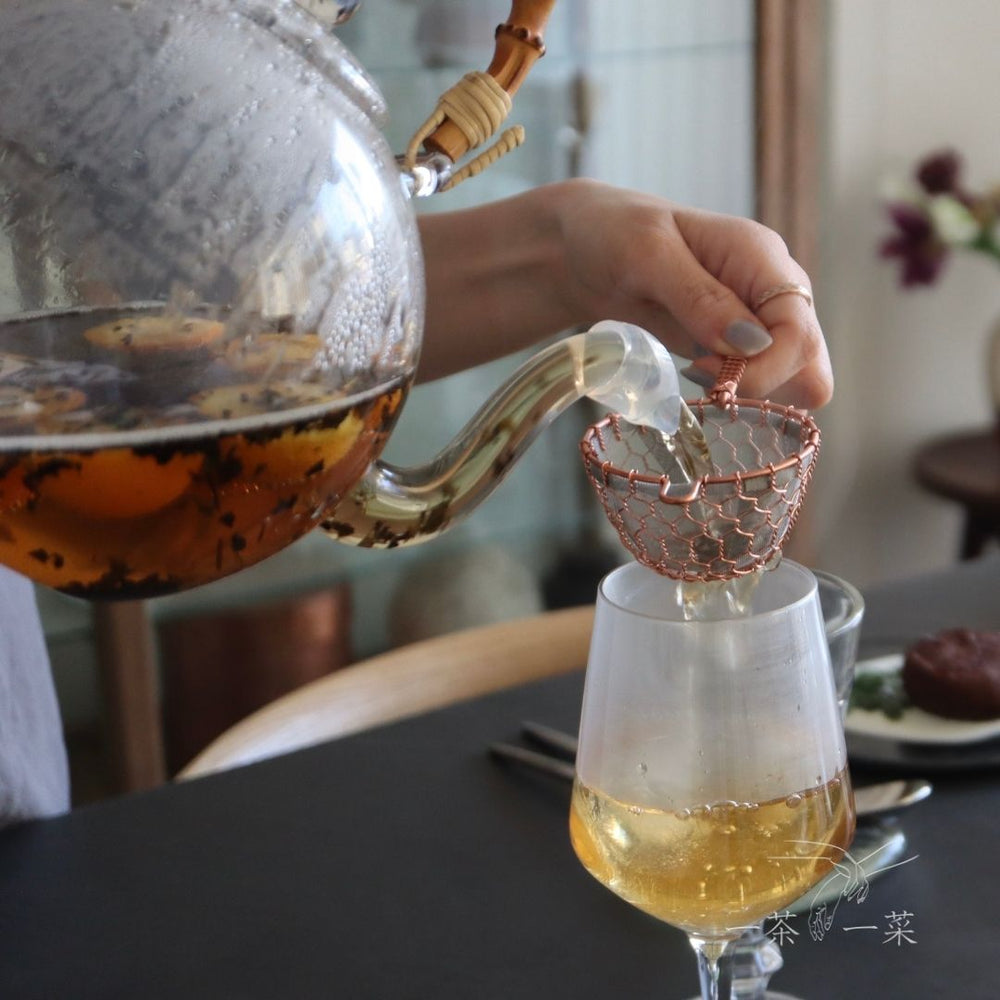フルーツを使ったブレンドティーは、季節ごとの私の楽しみの一つ。ガラスのティーポットを使うと、オレンジ色が琥珀色の紅茶とともに映え、光がさすと特に金柑の果汁がゆっくりと溶け出していく様子が感じられるようで、心が癒されるひとときです。ガラスのポットは日の出製作所のもの、茶漉しは金網辻のものを使用しています。