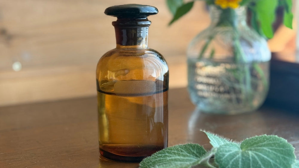 <アンティークのお薬瓶に入れたユキノシタ化粧水>