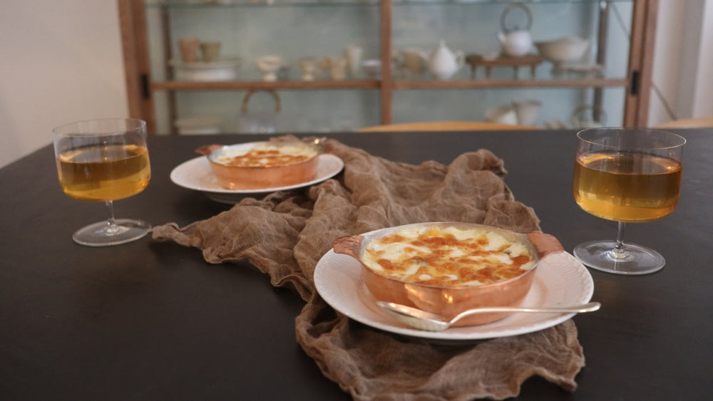 八木庖丁店の手打ち銅製のグラタン皿に入れて焼けば、いつものテーブルがちょっと華やかに。