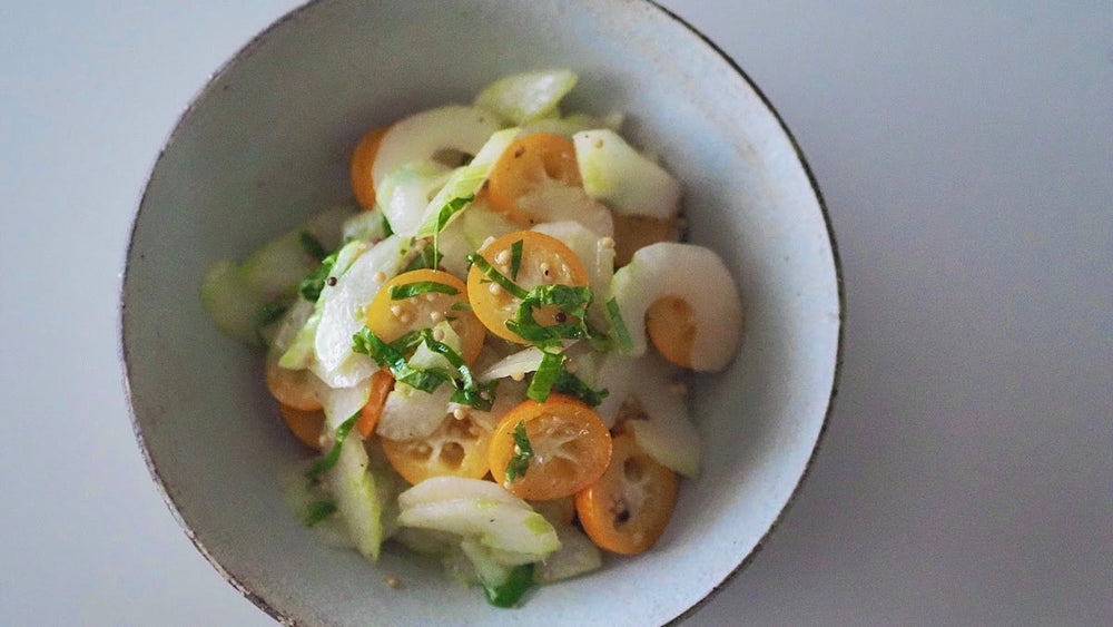 3. 調味料を合わせ、その中にきんかんとセロリを加え和え、30分以上寝かせる。