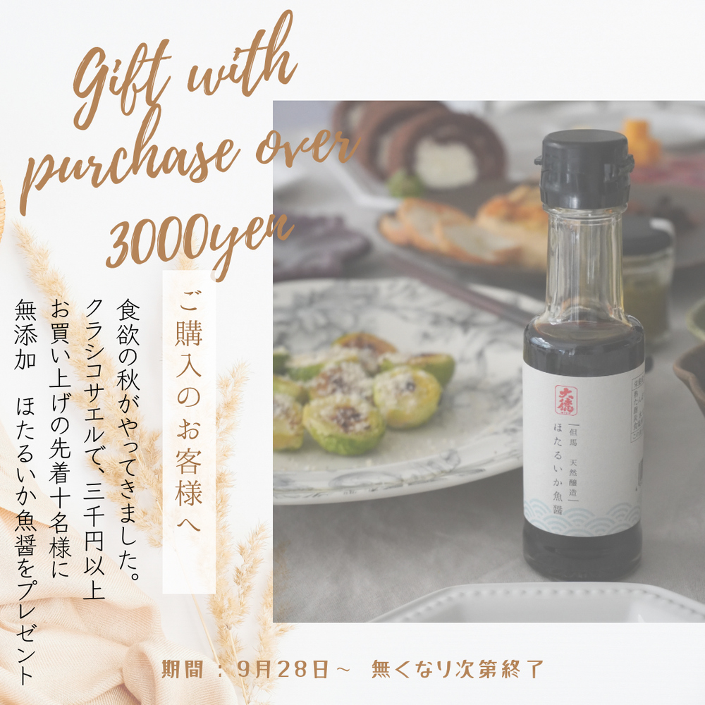 クラシコサエルで3000円以上お買い上げの先着10名様に【大徳醬油】添加ほたるいか魚醤をプレゼントいたします。