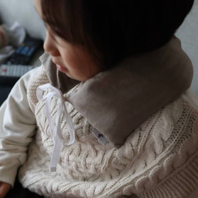 両肩で前から着用する形にすることで、首にかけるタイプよりも負担が少ない設計です。