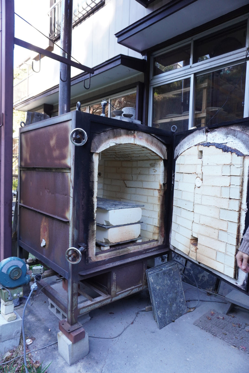 デッドスペースをいかに作らないか、カーブから考えられて作った自作の窯は灯油を焚いて焼成されています。