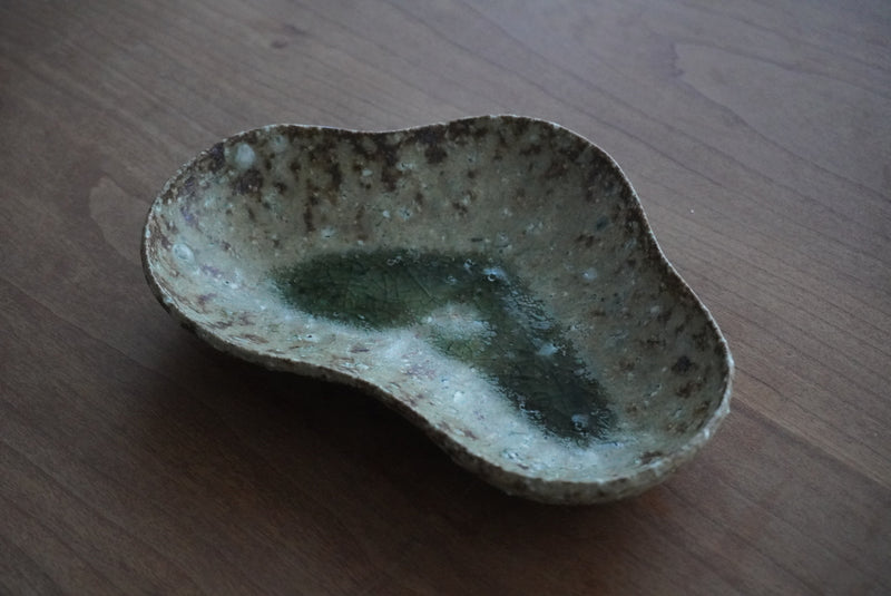 安達さんの釉薬(うわぐすり)は友人宅の薪ストーブの灰だったりして、個人的にはそういうのが面白いなぁと。釉薬の成分である灰に含まれる金属分の分量然り、焼成時に窯のどの位置に入っているによっても同じ配合でも仕上がりは変わってくるそうです。緑灰釉を使ったこちらの作品は、緑灰釉・三葉形浅鉢というお名前。ほかにもお庭の葉っぱから発想を経て緑灰釉・葉形と名付けられた器もありました。